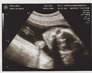 I kept taking deep breaths, and she kept asking me if I was okay. I told her that I was just nervous. I told her about the families I mentioned in my post last night, so she made sure she was very thorough in her examination (as I'm sure she always is). She had to check all of the baby's organs and stuff first to make sure all looked good before she got to the "fun part" of seeing if the baby was a boy or a girl. It felt almost like time was frozen. I started tearing up. I just laid there waiting for the tech to tell me something didn't look right, but she knew how worked up I was, so she talked me through everything she was doing and was quick to tell me that each area she checked looked good. With each area she checked off as okay, I breathed a little easier. The baby measured at 20 weeks and 4 days, weighing 13 ounces with a heart rate of 148 beats per minute.